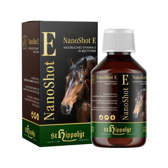 Vitamin E, souhrnným označením tokoferol, je důležitým antioxidantem a součástí buněčných membrán. Chrání cenné látky jako např. mastné kyseliny a lipoproteiny před volnými radikály a chrání buněčné membrány před oxidačním stresem. Pomocí inovativního procesu je přírodní vitamín E dispergován do těch nejjemnějších kapiček a micelizován nanodisperzí tak, aby byl transportovatelný ve vodných roztocích a dosáhl tak nejvyšší biologické dostupnosti. WES NanoShot E - vysoce účinný přírodní zdroj vitamínu E. Vhodný pro každý typ koně.